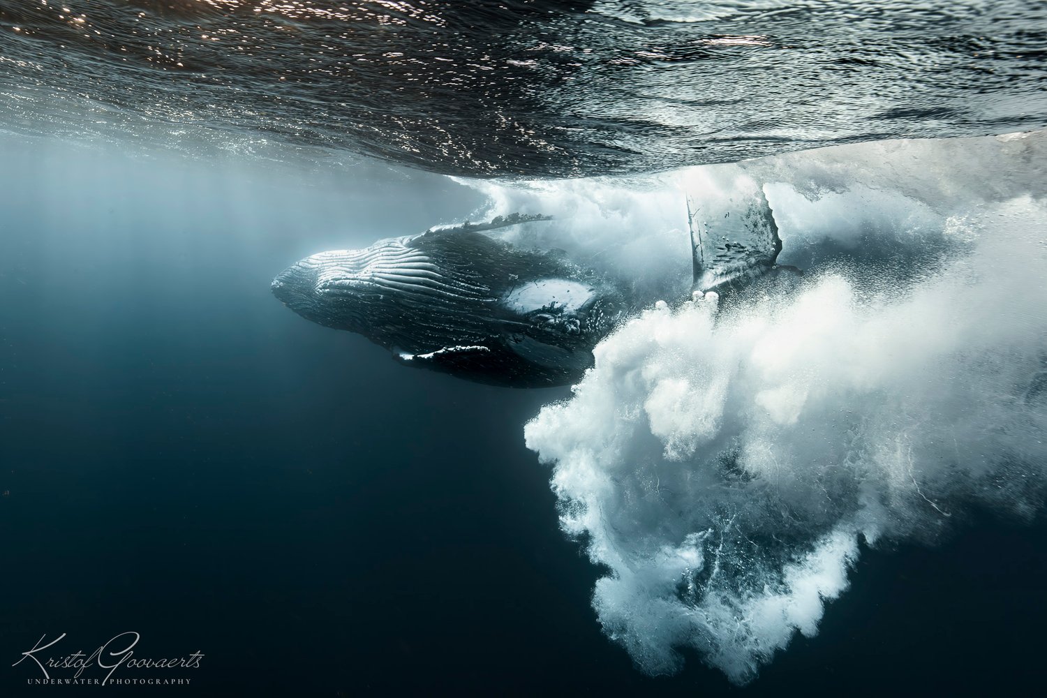 A humpback whale moves powerfully beneath the surface, tail sweeping and sending a cloud of bubbles in every direction. The sheer energy of the animal fills the frame, making the viewer feel the force and motion of life underwater.